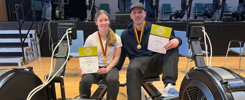 Johanna Bilz (18) und Daniel Nagl (37) holten in den Klassen SF19-29 Lgw. und MM30-39 zweimal Gold bei der Dt. Meisterschaft im 30min Ergometer-Rudern